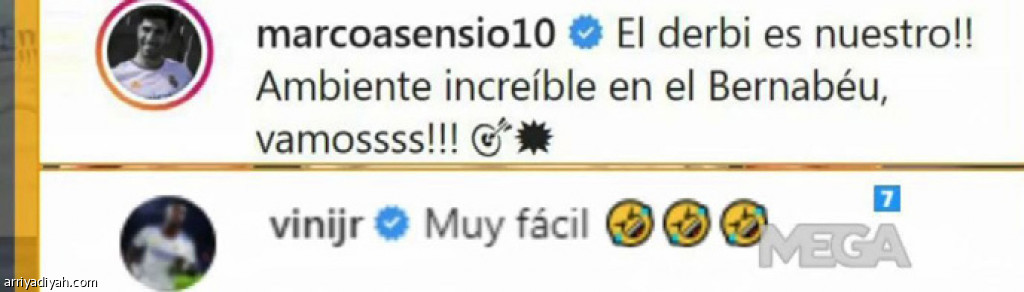 سخر البرازيلي فينيسيوس،لاعب فريق ريال مدريد، من عدم وجود منافسة قوية أمام أتلتيكو مدريد في المباراة التي فازوا فيها 2ـ0، حيث نشر الإسباني أسينسيو، زميله، صورة احتفالية وعلّق: “الديربي لنا”، ليرد فينيسيوس: “ديربي سهل” مع إيقونة ضحك.