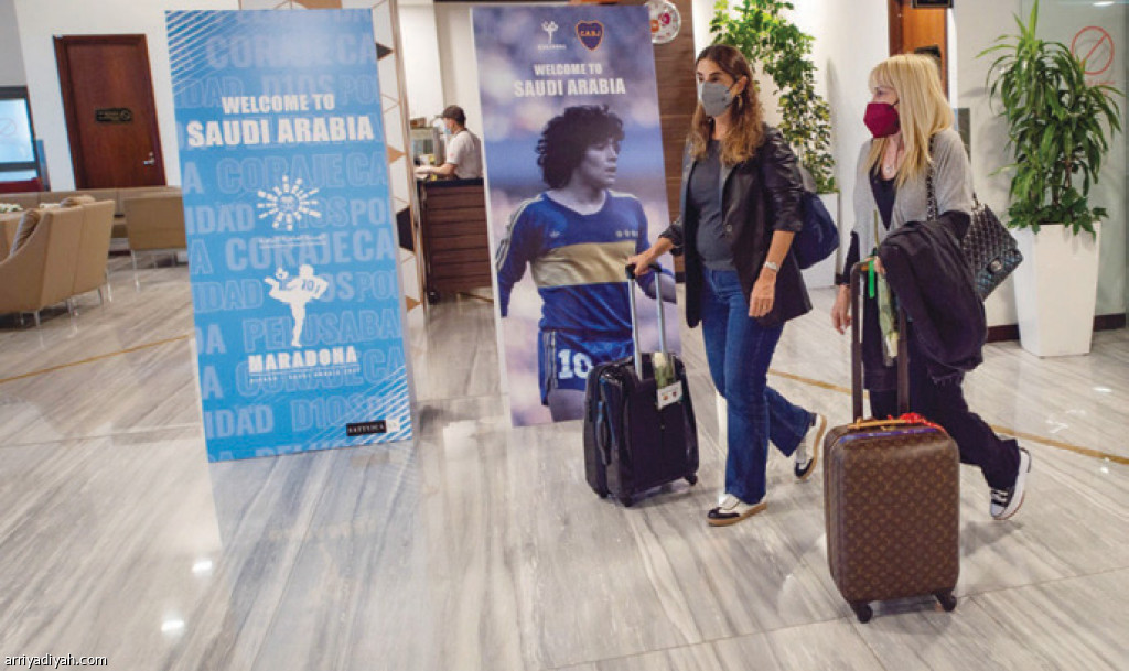 استعرض حساب الهيئة العامة للترفيه صورًا من وصول أسرة الأرجنتيني مارادونا إلى الرياض لمتابعة مباراة برشلونة وبوكاجونيورز حيث حرصوا على التقاط الصور مع اللافتة التي تحمل صورة الأسطورة في المطار.
