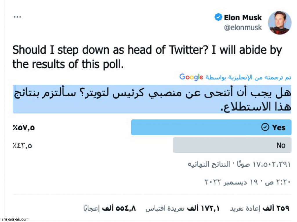 تفاعل مستخدمو موقع التدوينات القصيرة “تويتر” مع استفتاء مالكه إيلون ماسك، الذي سأل المغردين: “هل يجب أن أتنحى عن منصبي بوصفي رئيسًا لتويتر؟”، متعهدًا بأنه سيلتزم بنتائج الاستطلاع، حيث صوَّت 57.5 في المئة من المشاركين، الذين بلغ عددهم 17.5 مليون، بنعم.