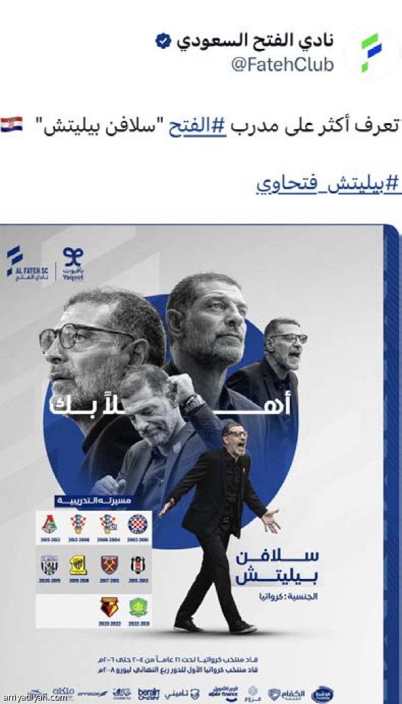 حظي حساب نادي الفتح بتفاعل واسع بعد إعلان التعاقد مع الكرواتي سلافين بيليتش لقيادة تدريب الفريق الأول لكرة القدم، خلال الـ 48 ساعة الماضية.