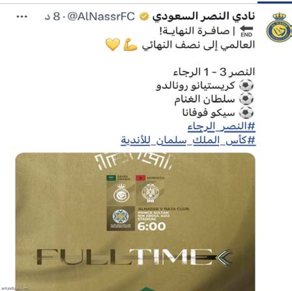 استحوذت مباراة فريق النصر الأول لكرة القدم، أمام منافسه الرجاء المغربي، التي كسبها الأول 3ـ1، أمس، ضمن ربع نهائي كأس الملك سلمان للأندية العربية، على اهتمامات مستخدمي موقع التدوينات القصيرة “إكس”.