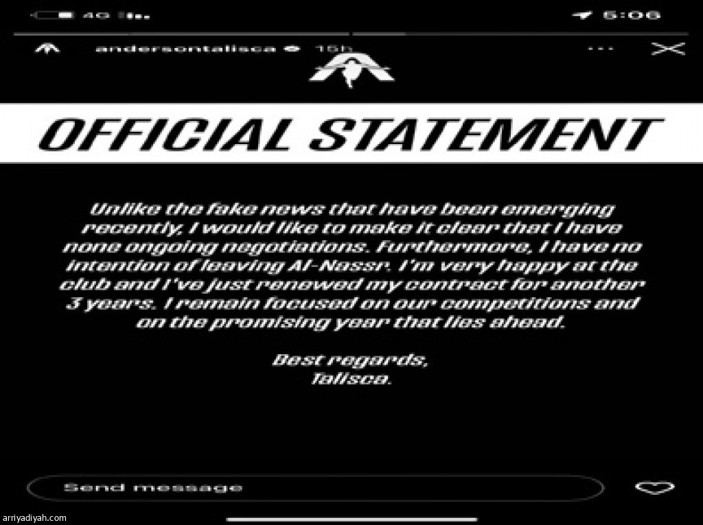 سيطر بيان البرازيلي أندرسون تاليسكا، مهاجم فريق النصر الأول لكرة القدم، الذي بثه عبر “إنستجرام”، على اهتمامات مستخدمي منصة “إكس” بحصده تفاعلًا، وصل إلى مليوني مشاهدة. ونفى المهاجم البرازيلي في بيانه الشائعات التي تمَّ تداولها حول رحيله عن النصر. وجاءت غالبية الردود مطالبةً ببقائه، منهم حساب “سولف”، الذي كتب: “أي نصراوي يبيه يطلع، والله ما يفهم. مفيد أكثر من رونالدو بمراحل”. بينما خالفه سطام قائلًا: “يا ليل الناشب ذا”.