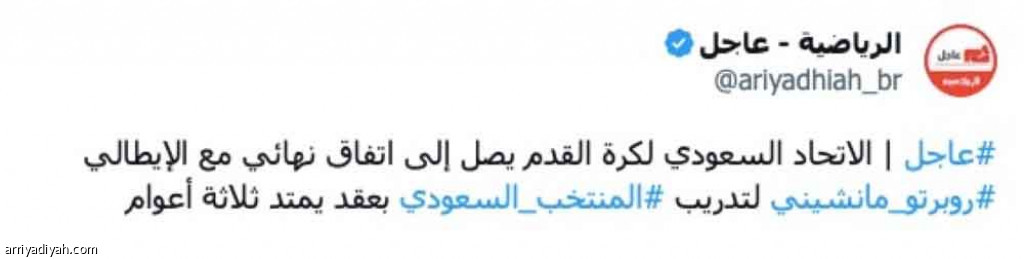 سيطر خبر حساب “الرياضية عاجل”، الذي كشف فيه عن اتفاق الاتحاد السعودي لكرة القدم مع الإيطالي روبرتو مانشيني لتدريب المنتخب السعودي الأول بعقد يمتدُّ ثلاثة أعوام، على اهتمامات مستخدمي موقع التدوينات القصيرة “إكس” خلال الـ 24 ساعة الماضية.