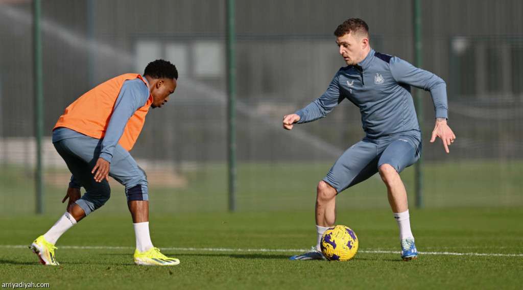 المدافع كيران تريبير وجو ويلوك لاعب الوسط خلال الحصة التدريبية لفريق نيوكاسل الإنجليزي الأربعاء (المركز الإعلامي ـ نيوكاسل)
