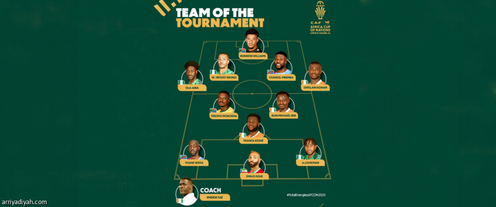 اختار الاتحاد الإفريقي لكرة القدم «كاف»، الأربعاء، فرانك كيسي، وجيسلان كونان، لاعبي فريق الأهلي والفيحاء الأول لكرة القدم، ضمن التشكيلة المثالية لكأس الأمم الإفريقية 2024، التي استضافتها كوت ديفوار، وتوجت بلقبها، بعد فوزها في المباراة النهائية على منتخب نيجيريا «2ـ1».