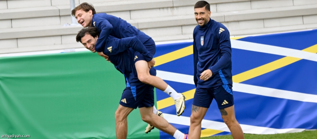 نيكولو باريلا، لاعب وسط المنتخب الإيطالي الأول لكرة القدم، يمازح زميله المدافع ماتيو دارميان، خلال تدريب الجمعة، ويظهر خلفهما الجناح ماتيا زاكاني (الأوروبية)