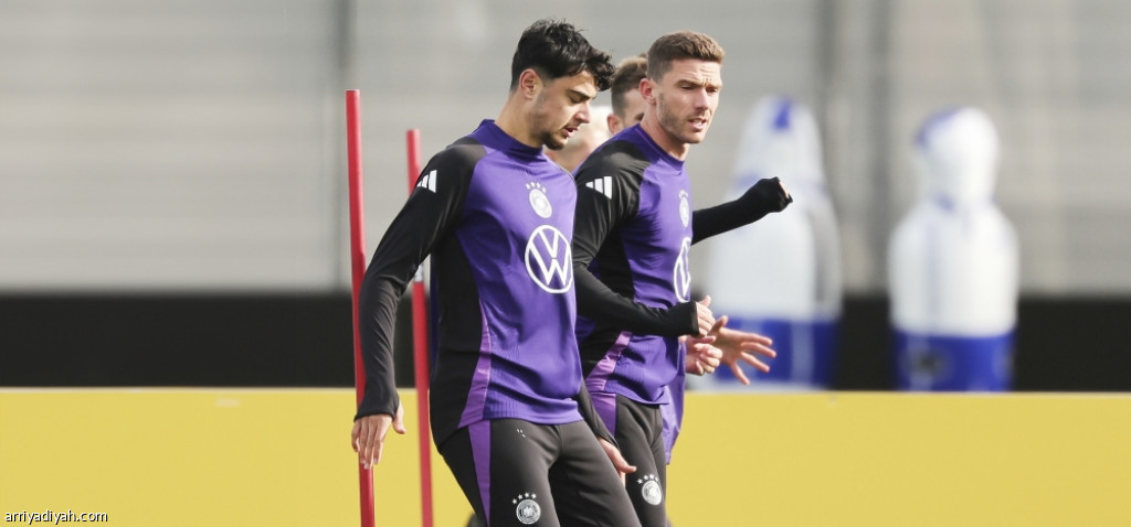 ألكسندر بافلوفيتش وروبن جوسينس، لاعبا المنتخب الألماني الأول لكرة القدم، الأحد، أثناء مشاركتهما في الجلسة التدريبية الأخيرة للماكينات (الفرنسية)