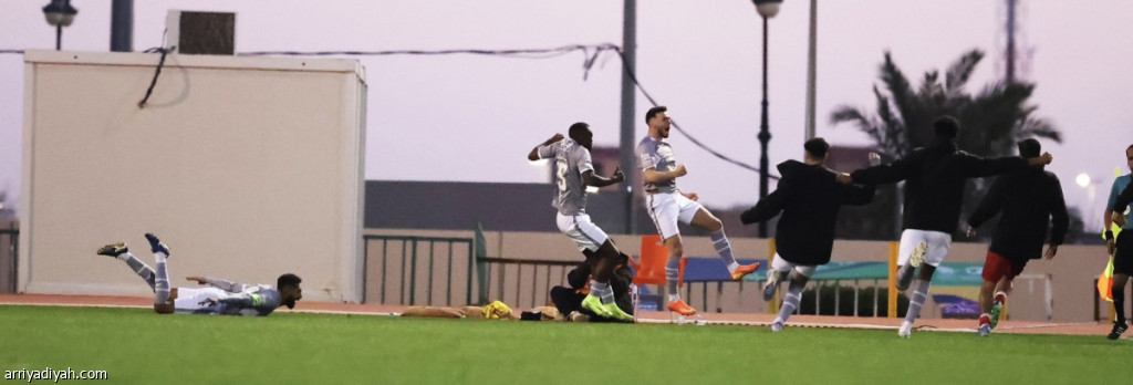 الروماني أندريه كورديا، لاعب فريق الطائي، يحتفل بهدفه القاتل في مرمى الزلفي، خلال المواجهة التي جمعتهما، السبت (المركز الإعلامي ـ دوري يلو)