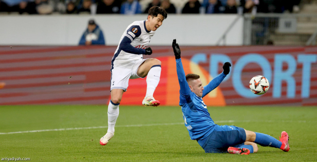 أوليفر باومان، حارس مرمى هوفنهايم، يحاول التصدي لكرة الكوري الجنوبي سونج هيونج مين، قائد توتنام، قبل ولوجها الشباك معلنة الهدف الثاني للفريق الإنجليزي. (الفرنسية)