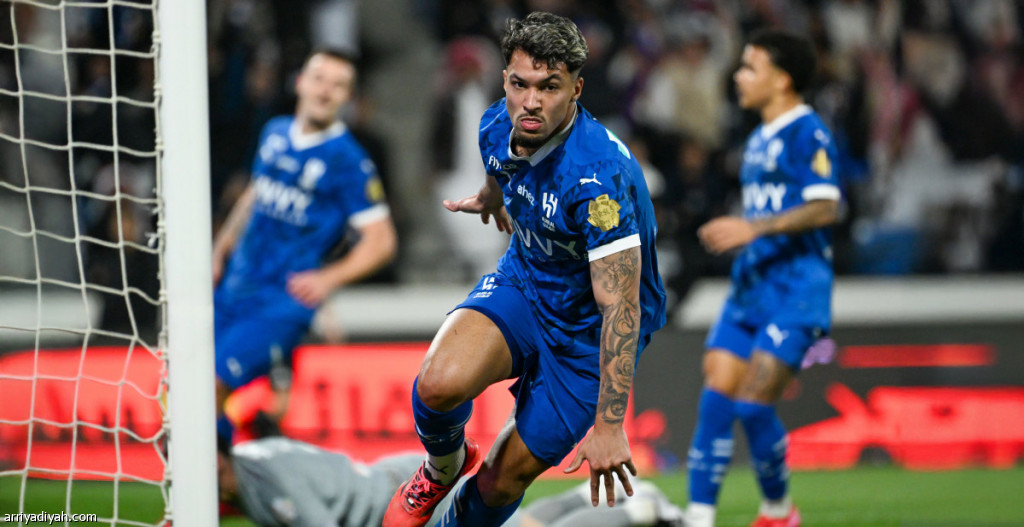 البرازيلي ماركوس ليوناردو، مهاجم فريق الهلال الأول لكرة القدم، لحظة إحرازه هدفًا أمام ضمك، السبت الماضي، ضمن الجولة الـ 19 من دوري روشن السعودي تصوير: علي خمج